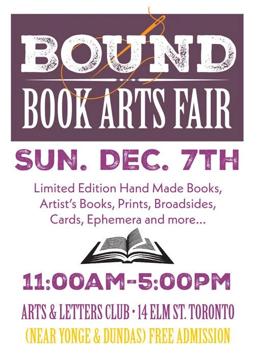 The annual BOUND Book Arts Fair will take place this year on Sunday, December 7th, 2025, at the Arts & Letters Club, 14 Elm Street, in Toronto (just west off Yonge, a block south of Gerrard).